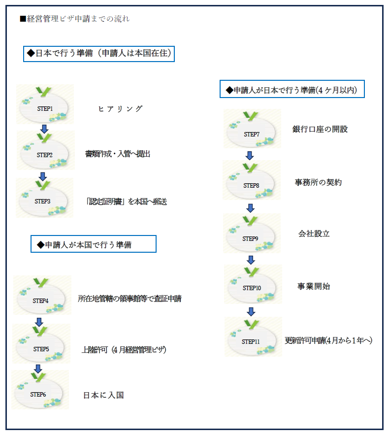 そのため、無事許可が下り、日本に来てから本番となり、来日の4ケ月以内に銀行口座を作り、資本金の入金、事務所の確保、会社設立などの全てを整え、4ケ月の経営管理ビザから1年への更新手続きを行う事になります。